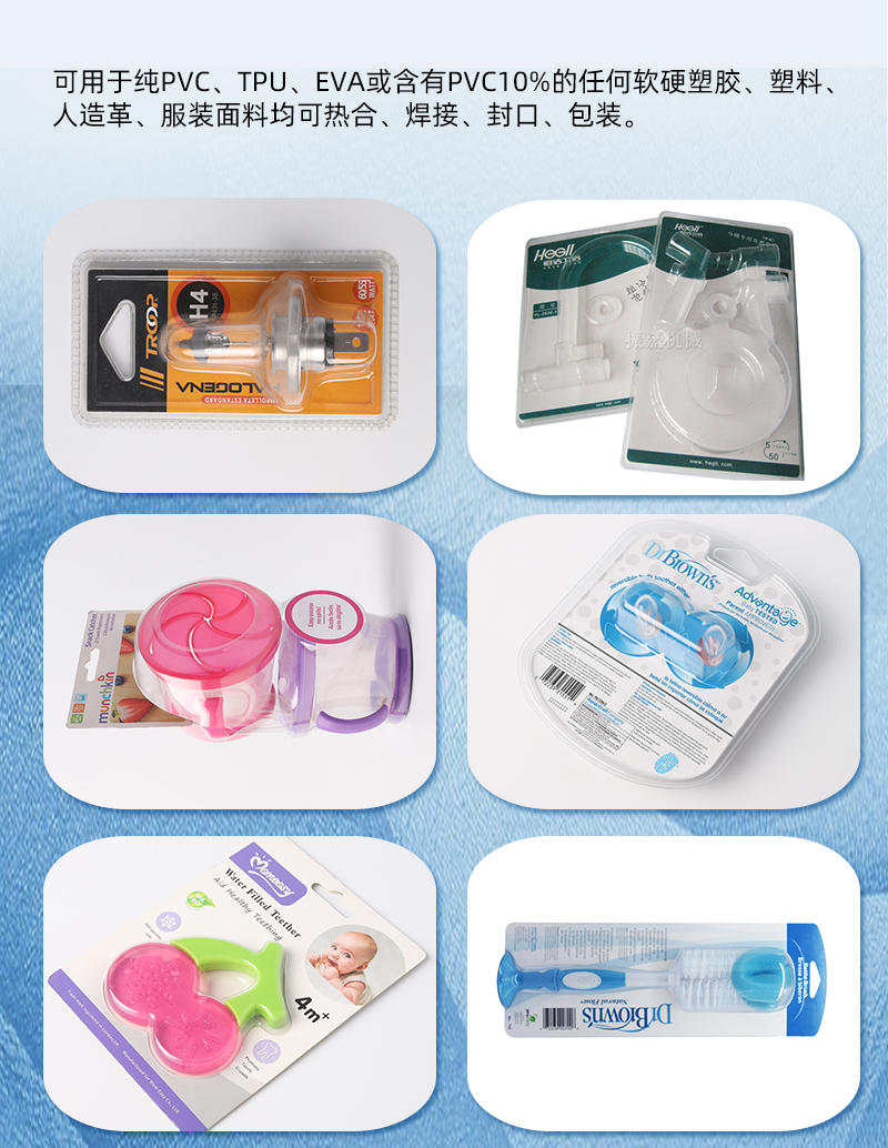 1.用途:可用于純PVC、TPU、EVA或含有PVC10%的任何軟硬塑膠、塑料、人造革、服裝面料均可熱合、焊接、封口、包裝。